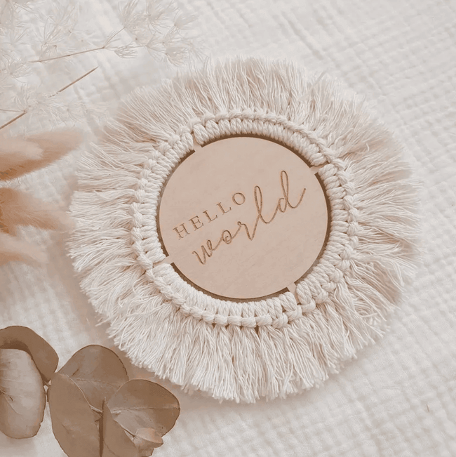 "Hello World" Macrame Birth Announcement Sign